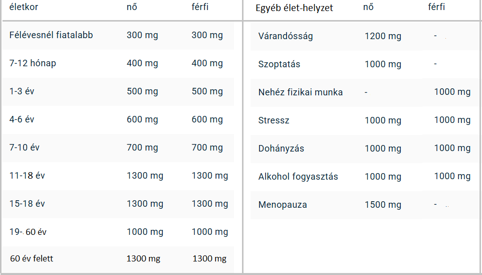 Átlagosan a felnőttek napi igénye 1000-1300 mg körül mozog, de egyes élethelyzetek befolyásolhatják ezt az értéket.